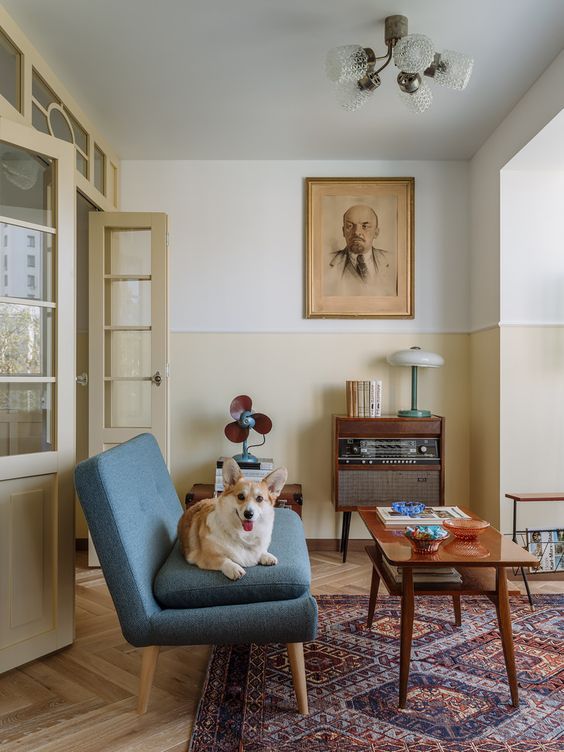 Ну и, конечно, декор. Загляните в сервант к мамам или бабушкам, там найдется много интересного: так называемый агитфарфор или просто фарфоровые фигурки того времени, сервизы с невероятными оранжевыми горошинами или знаменитой кобальтовой сеткой, матрёшки, ложки, старые фотоаппарты и даже, возможно, транзистор с кожаной ручкой. Разбавьте это яркими постерами или картинами в стиле ВХУТЕМАСа, дополните аутентичными светильниками с тканевым абажуром или наоборот стальным циркулеобразным и вы не останетесь равнодушным к полученному пространству. Главное, берегите «олдскулы», чтобы их не свело ностальгией А если серьезно, вы обязательно оцените такое пространство, ведь это уже история, но все еще такие теплые воспоминания из нашего собственного детства.